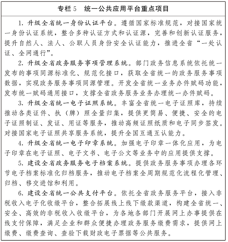 推進(jìn)數(shù)字化共性應(yīng)用集約化建設(shè),為各地各部門提供身份認(rèn)證、電子證照、電子印章、電子檔案、便民支付、服務(wù)熱線、服務(wù)融合等公共應(yīng)用支撐。