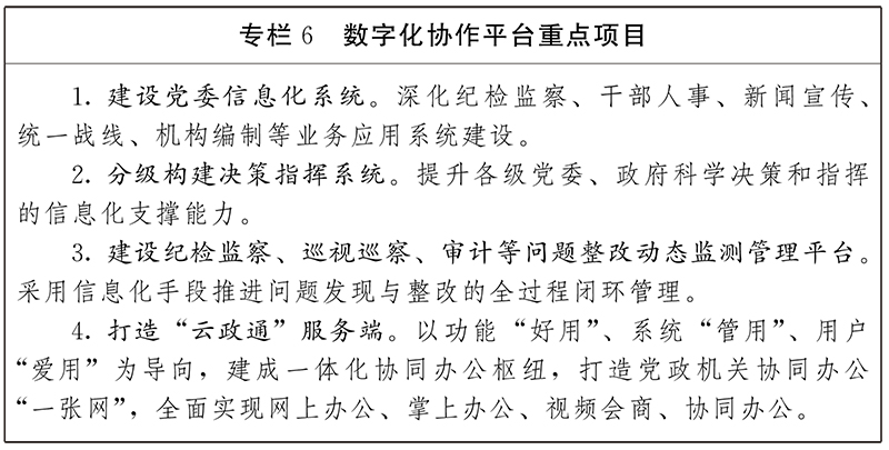 2.統(tǒng)建共用協(xié)同辦公平臺。統(tǒng)籌推進(jìn)協(xié)同辦公、數(shù)據(jù)共享、信息報送、督查督辦等基礎(chǔ)應(yīng)用建設(shè),加快內(nèi)部辦公和業(yè)務(wù)系統(tǒng)整合共享與升級改造,形成服務(wù)送達(dá)、綜合辦理、數(shù)據(jù)監(jiān)測、監(jiān)督反饋的業(yè)務(wù)閉環(huán)。建設(shè)統(tǒng)一的協(xié)同辦公平臺“云政通”,支撐各地各部門組織、人員信息在線分級分層管理,實現(xiàn)非涉密公文全程電子化流轉(zhuǎn)管理、歸檔移交、遠(yuǎn)程會議音視頻互動,推進(jìn)工作交流會商在線化、移動化、協(xié)同化。加快一體化協(xié)同辦公體系建設(shè),推動實現(xiàn)機(jī)關(guān)內(nèi)部及部門間“一件事”高效協(xié)同辦理,積極推行移動辦公。推動機(jī)關(guān)事務(wù)辦公用房、公務(wù)用車、公共機(jī)構(gòu)節(jié)能等應(yīng)用整體升級,降低運(yùn)行成本。