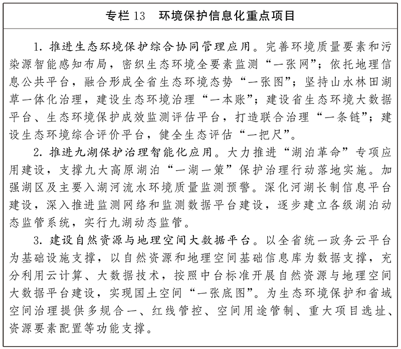 1.加強(qiáng)生態(tài)環(huán)境保護(hù)數(shù)字化應(yīng)用。以地理信息公共服務(wù)平臺為支撐,加強(qiáng)衛(wèi)星遙感、無人機(jī)、視頻監(jiān)控、傳感器“四位一體”綜合應(yīng)用,完善生態(tài)環(huán)境監(jiān)測網(wǎng)絡(luò),優(yōu)化監(jiān)測點位布局,廣泛開展生態(tài)監(jiān)測物聯(lián)網(wǎng)應(yīng)用。充分利用大數(shù)據(jù)等手段整合與挖掘生態(tài)環(huán)境監(jiān)測數(shù)據(jù)資源,提升區(qū)域大氣污染防治、流域污染防治、土壤污染防治等決策能力,構(gòu)建生態(tài)環(huán)境綜合管理信息化平臺。構(gòu)建重點江河湖泊治理數(shù)字化平臺,匯集生態(tài)環(huán)境、水利、自然資源等部門的基礎(chǔ)數(shù)據(jù),重點建設(shè)智能感知、數(shù)據(jù)匯集、綜合應(yīng)用、多維展示、決策支撐等系統(tǒng)。