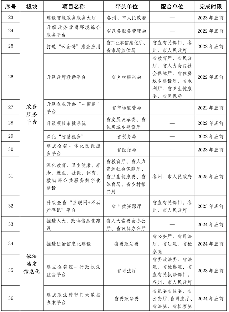 5.回應(yīng)各類民生關(guān)切,簡化個人服務(wù)“便利辦”。推動證照辦理、報警求助、交通出行、出國出境等公安機(jī)關(guān)服務(wù)事項網(wǎng)上咨詢、網(wǎng)上預(yù)約、網(wǎng)上辦理。建成覆蓋全省的教育治理公共服務(wù)平臺和教育大數(shù)據(jù)中心,促進(jìn)教育資源有序流動和開放共享,支撐教育管理精準(zhǔn)化和教育服務(wù)數(shù)字化。推進(jìn)民政信息化建設(shè),實現(xiàn)對居民家庭經(jīng)濟(jì)和低收入人口狀況的動態(tài)監(jiān)測預(yù)警,提升社會救助等民生保障能力。推進(jìn)“互聯(lián)網(wǎng)+醫(yī)療健康”業(yè)務(wù)應(yīng)用,提升衛(wèi)生健康數(shù)字化服務(wù)能力。推進(jìn)“互聯(lián)網(wǎng)+醫(yī)保服務(wù)”,建成全省一體化醫(yī)保服務(wù)平臺,全面推廣醫(yī)保電子憑證,實現(xiàn)醫(yī)保繳費(fèi)、個人權(quán)益查詢、資格認(rèn)證、處方流轉(zhuǎn)、在線辦理、便民醫(yī)療、就醫(yī)購藥等服務(wù)整合。建設(shè)全省統(tǒng)一的社會保險、公共就業(yè)、人事人才、勞動關(guān)系經(jīng)辦體系信息系統(tǒng),推進(jìn)電子社保卡提供身份認(rèn)證服務(wù)和在政務(wù)服務(wù)領(lǐng)域應(yīng)用。推動體育管理數(shù)字化賦能,構(gòu)建數(shù)字體育服務(wù)體系。建設(shè)全省性養(yǎng)老服務(wù)數(shù)據(jù)資源中心及應(yīng)用服務(wù)平臺,提升養(yǎng)老服務(wù)數(shù)字化水平。完善全省政務(wù)服務(wù)平臺適老化、無障礙功能,持續(xù)優(yōu)化特殊群體政務(wù)服務(wù)。