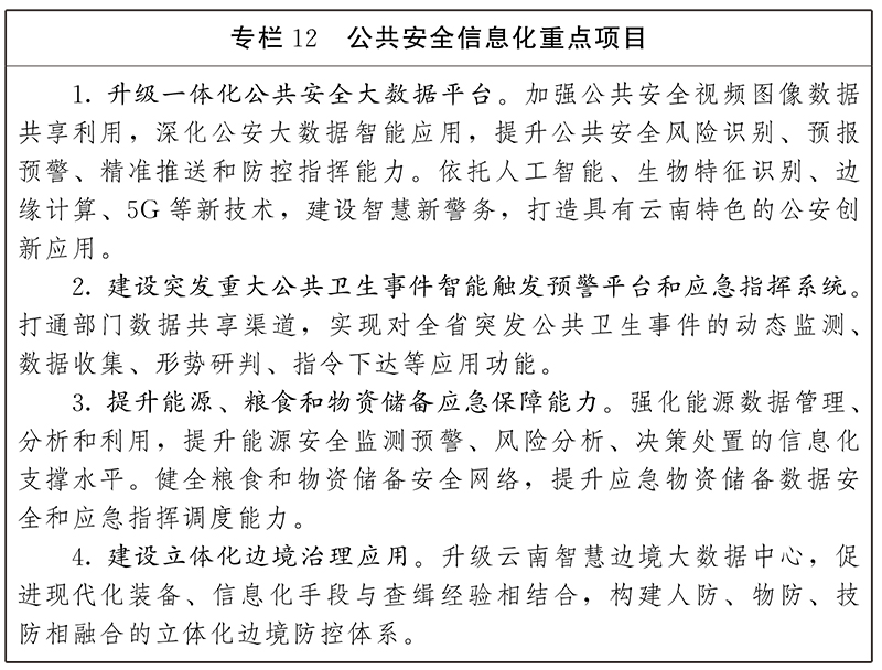 2.加強(qiáng)社會治安數(shù)字化應(yīng)用。推動數(shù)字技術(shù)在法院、檢察院和司法行政、公安等部門的深度運(yùn)用,打通辦案平臺,實現(xiàn)全流程網(wǎng)上“輕快”、“便捷”辦案。健全信息化社會治安防控體系,實現(xiàn)預(yù)測預(yù)警預(yù)防。推進(jìn)“雪亮工程”建設(shè),整合各類視頻監(jiān)控資源,加大在維穩(wěn)、反恐、打擊犯罪等公共安全防范領(lǐng)域的綜合應(yīng)用,提升防范化解社會風(fēng)險的能力和水平。加快部署智能感知、信息采集等基礎(chǔ)設(shè)施,構(gòu)建邊境管控數(shù)字防控網(wǎng),推進(jìn)邊境管控數(shù)字化應(yīng)用,開展邊境車輛、人員大數(shù)據(jù)分析研判,提升邊境管控指揮系統(tǒng)可視化、數(shù)字化、智能化水平。