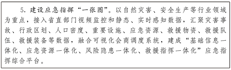 3.構(gòu)建數(shù)字應(yīng)急體系。聚焦地震、地質(zhì)災(zāi)害、森林草原火災(zāi)、洪澇、干旱、氣象等自然災(zāi)害,以及危險化學(xué)品、煙花爆竹、礦山、道路交通、民爆、消防、旅游景點等安全領(lǐng)域,推進(jìn)應(yīng)急指揮信息網(wǎng)絡(luò)和感知網(wǎng)絡(luò)建設(shè)、現(xiàn)場救援裝備和應(yīng)急資源數(shù)據(jù)匯聚建設(shè)、風(fēng)險隱患監(jiān)測預(yù)警和監(jiān)管執(zhí)法建設(shè),實現(xiàn)應(yīng)急指揮“一張圖”綜合管理,提高風(fēng)險防控和突發(fā)災(zāi)害事故應(yīng)急處置能力。