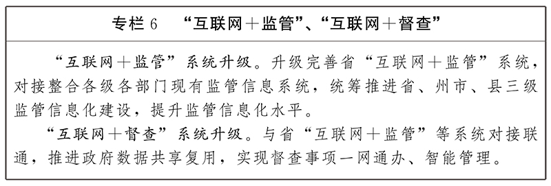 推進(jìn)“互聯(lián)網(wǎng)+監(jiān)管”建設(shè)。升級完善省“互聯(lián)網(wǎng)+監(jiān)管”系統(tǒng),建立健全監(jiān)管履職評估評價體系,實現(xiàn)監(jiān)管對象全覆蓋、監(jiān)管過程全記錄、監(jiān)管數(shù)據(jù)可共享可分析可預(yù)警,推動事中事后監(jiān)管標(biāo)準(zhǔn)化、規(guī)范化、精準(zhǔn)化。建立全省統(tǒng)一的執(zhí)法信息公示平臺,依法公開行政執(zhí)法職責(zé)、依據(jù)、程序、結(jié)果等,接受社會監(jiān)督。