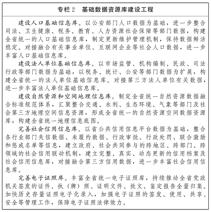 加快構(gòu)建并完善人口、法人、自然資源和空間地理、社會信用信息庫、電子證照庫等基礎(chǔ)庫以及各地各部門業(yè)務(wù)主題庫和有關(guān)專題庫,動態(tài)更新、疊加、關(guān)聯(lián)數(shù)據(jù),形成多維度的人、事、物信息體系。加快完善可信數(shù)據(jù)共享交換體系,建設(shè)統(tǒng)一的政務(wù)數(shù)據(jù)共享交換平臺、數(shù)據(jù)資源目錄,省直各部門已建、新建非涉密系統(tǒng)采用數(shù)據(jù)接口方式接入平臺,加快各類政務(wù)數(shù)據(jù)共享。建立全省統(tǒng)一數(shù)據(jù)標(biāo)準(zhǔn)和重點行業(yè)數(shù)據(jù)標(biāo)準(zhǔn),為數(shù)據(jù)治理、數(shù)據(jù)管理、數(shù)據(jù)分析等提供依據(jù)。落實數(shù)據(jù)質(zhì)量保障責(zé)任,建立數(shù)據(jù)質(zhì)量管理閉環(huán)。根據(jù)部門職責(zé)按需依法依規(guī)使用共享數(shù)據(jù),加強(qiáng)共享數(shù)據(jù)使用全過程管理。編制政務(wù)數(shù)據(jù)開放目錄,建設(shè)統(tǒng)一的政務(wù)數(shù)據(jù)開放平臺,向社會提供開放政務(wù)數(shù)據(jù)的查詢、下載、應(yīng)用接口等服務(wù),開展創(chuàng)新應(yīng)用。
