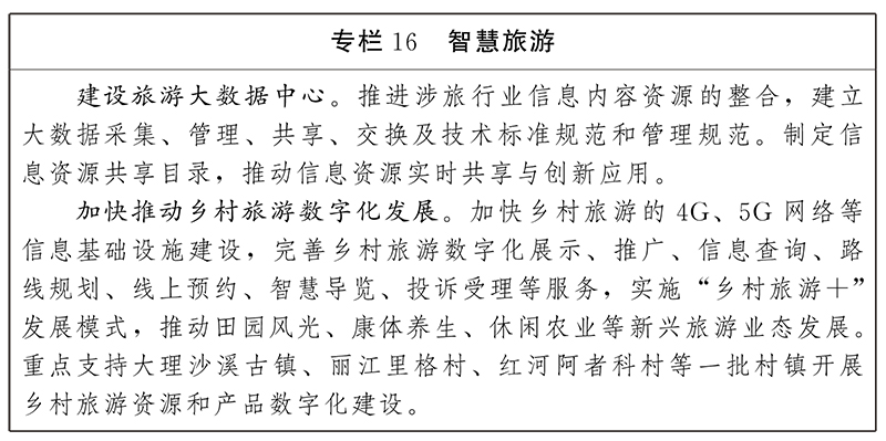 持續(xù)深化智慧旅游發(fā)展。持續(xù)優(yōu)化升級“一部手機(jī)游云南”,推進(jìn)文化和旅游綜合性服務(wù)體系建設(shè)。加快智慧旅游信息基礎(chǔ)設(shè)施建設(shè),在全省3A級以上旅游景區(qū)、星級賓館、旅游集中區(qū)、州市級公共文化服務(wù)場所實現(xiàn)智能導(dǎo)游、電子講解、刷臉認(rèn)證等服務(wù)全覆蓋,加快重點旅游核心區(qū)5G部署,打造“5G+智慧旅游”應(yīng)用。以大理古城、麗江古城、玉龍雪山等為重點,打造全國智慧旅游景區(qū)樣板。打造租車、包車等智慧旅游交通出行服務(wù),打通景區(qū)交通“最后一公里”,推動省內(nèi)各大交通樞紐到重點旅游城市、景區(qū)的無縫對接、零距離換乘和高效接駁。加快建立智慧旅游標(biāo)準(zhǔn)體系和統(tǒng)計體系,搭建文化和旅游可視化綜合管理體系,實現(xiàn)市場綜合執(zhí)法、市場主體信用建設(shè)、游客投訴受理與處置等數(shù)字化服務(wù)管理。