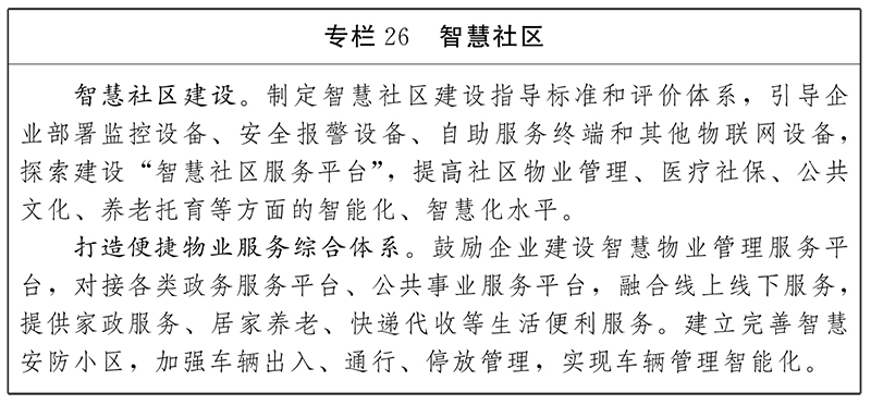 創(chuàng)新智慧社區(qū)服務(wù)。在有條件的社區(qū)開展網(wǎng)絡(luò)設(shè)施、智能終端等建設(shè),深化社區(qū)網(wǎng)格化數(shù)字管理模式應(yīng)用,持續(xù)完善在線矛盾糾紛多元化解平臺,有效提升基層矛盾化解能力。鼓勵社區(qū)服務(wù)企業(yè)打造便捷物業(yè)服務(wù)綜合體系,推動物業(yè)管理、家政服務(wù)等應(yīng)用創(chuàng)新,發(fā)展社區(qū)智慧養(yǎng)老托育等服務(wù)。打通物流配送“最后一公里”,發(fā)展快遞自提點、快遞超市、智能快遞箱等服務(wù)。