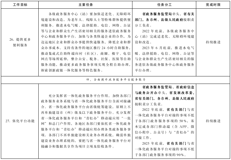 19.推動更多政務服務事項“網(wǎng)上辦、掌上辦”。按照“應上盡上”原則,除法律法規(guī)另有規(guī)定或特殊事項外,全部政務服務事項納入省一體化政務服務平臺和移動端辦理,實現(xiàn)“網(wǎng)上辦、掌上辦”。持續(xù)優(yōu)化辦事流程、精簡環(huán)節(jié),提供“網(wǎng)上申請、網(wǎng)上審批、郵遞送達”不見面審批服務,提升網(wǎng)上辦理深度,實現(xiàn)由“網(wǎng)上可辦”到“網(wǎng)上好辦易辦”轉變。(牽頭單位:省政務服務監(jiān)管局;責任單位:省有關部門,各市州、縣級人民政府;完成時限:持續(xù)推進)