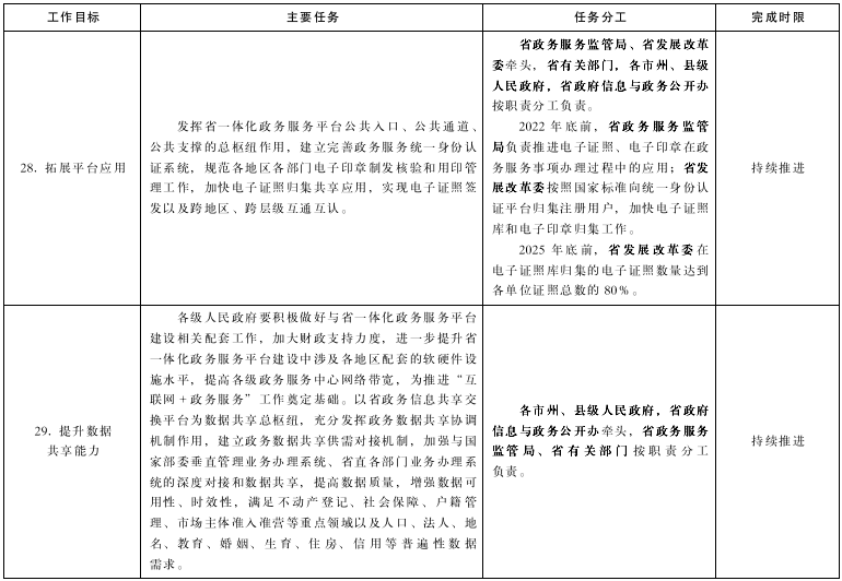 28.拓展平臺應用。發(fā)揮省一體化政務服務平臺公共入口、公共通道、公共支撐的總樞紐作用,建立完善政務服務統(tǒng)一身份認證系統(tǒng),規(guī)范各地區(qū)各部門電子印章制發(fā)核驗和用印管理工作,加快電子證照歸集共享應用,實現(xiàn)電子證照簽發(fā)以及跨地區(qū)、跨層級互通互認。(牽頭單位:省政務服務監(jiān)管局、省發(fā)展改革委;責任單位:省有關部門,各市州、縣級人民政府,省政府信息與政務公開辦;完成時限:持續(xù)推進)