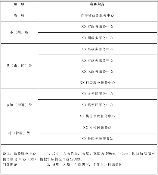6.規(guī)范政務服務場所設立。各級人民政府要統(tǒng)籌建設政務服務場所,滿足企業(yè)和群眾辦事需求。規(guī)范統(tǒng)一全省政務服務場所名稱,省、市(州)、縣(市、區(qū)、行委)為政務服務中心,鄉(xiāng)鎮(zhèn)(街道)為便民服務中心,村(社區(qū))為便民服務站。鄉(xiāng)鎮(zhèn)(街道)、村(社區(qū))可依托黨群服務中心開展政務服務工作,加掛便民服務中心(站)牌子。各級政務服務中心、便民服務中心(站)要在顯著位置設立全省統(tǒng)一的政務服務標識標牌,在青海政務服務網(wǎng)各地區(qū)頁面提供政務服務地圖,方便辦事群眾識別查找。各部門單設的政務服務窗口原則上應整合并入本級政務服務中心,確不具備整合條件的,要納入本級政務服務中心實行一體化管理,并接受本級政務服務監(jiān)管機構的服務規(guī)范指導,提供規(guī)范化服務,參照本級政務服務中心的規(guī)范化管理要求,建立運行管理機制,加強人員管理,做好年度考核工作。(牽頭單位:省政務服務監(jiān)管局;責任單位:省有關部門,各市州、縣級人民政府;完成時限:2022年底前)