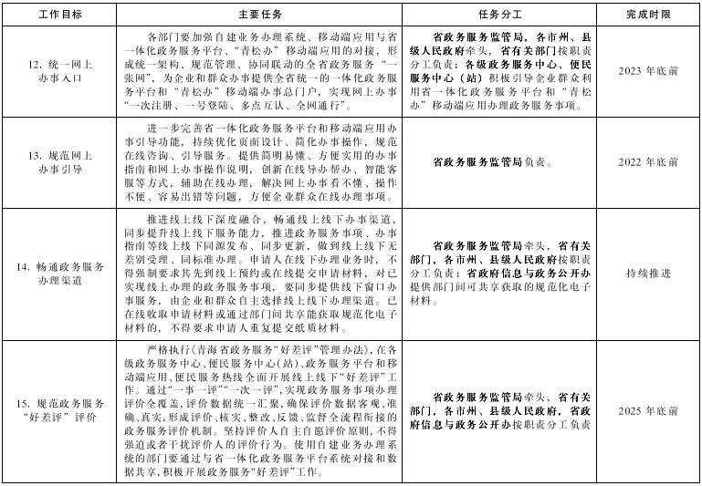 2022年底前,省、市(州)、縣(市、區(qū)、行委)、鄉(xiāng)鎮(zhèn)(街道)、村(社區(qū))五級政務服務能力和水平顯著提升,建立全省政務服務事項基本目錄清單并進行動態(tài)管理,各級政務服務中心規(guī)范、高效運行,綜合服務窗口全覆蓋,為企業(yè)和群眾辦事提供全省統(tǒng)一的一體化政務服務平臺總門戶,“一網(wǎng)通辦”服務能力顯著提升,企業(yè)和群眾經(jīng)常辦理的政務服務事項實現(xiàn)“跨省通辦”;2025年底前,全省政務服務標準化、規(guī)范化、便利化水平大幅提升,省一體化政務服務平臺服務能力全面提升,“網(wǎng)上辦、掌上辦、就近辦、一次辦”更加好辦易辦,政務服務線上線下深度融合、協(xié)調(diào)發(fā)展,高頻電子證照實現(xiàn)全省互通互認,高頻政務服務事項實現(xiàn)全省無差別受理、同標準辦理,“免證辦”全面推行,全面打響政務服務“青松辦”品牌。
