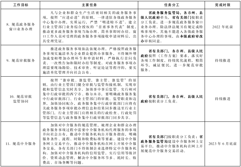 1.明確政務服務事項范圍。政務服務事項包括依申請辦理的行政權力事項和公共服務事項,行政權力事項包括行政許可、行政確認、行政裁決、行政給付、行政獎勵、行政備案及其他行政權力事項。公共教育、勞動就業(yè)、社會保險、醫(yī)療衛(wèi)生、養(yǎng)老服務、社會服務、住房保障、文化體育、殘疾人服務等領域依申請辦理的公共服務事項全部納入政務服務事項范圍。(牽頭單位:省政府審改辦;責任單位:省有關部門,各市州、縣級人民政府;完成時限:2023年底前)