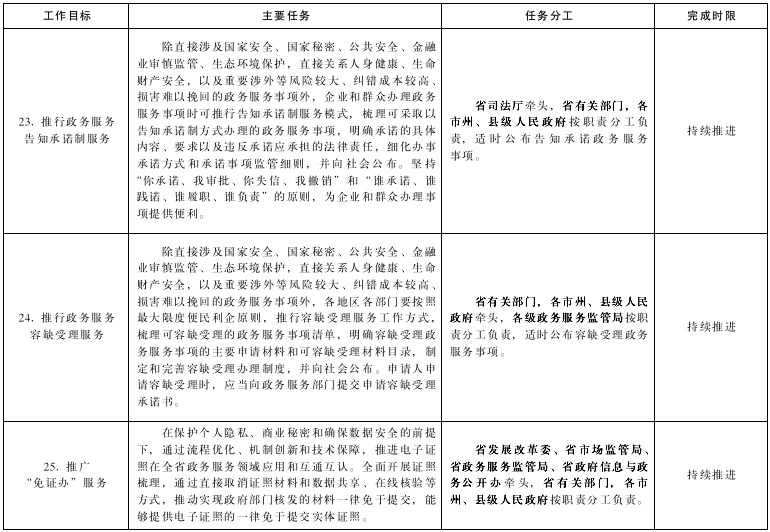 23.推行政務服務告知承諾制服務。除直接涉及國家安全、國家秘密、公共安全、金融業(yè)審慎監(jiān)管、生態(tài)環(huán)境保護,直接關系人身健康、生命財產(chǎn)安全,以及重要涉外等風險較大、糾錯成本較高、損害難以挽回的政務服務事項外,企業(yè)和群眾辦理政務服務事項時可推行告知承諾制服務模式,梳理可采取以告知承諾制方式辦理的政務服務事項,明確承諾的具體內(nèi)容、要求以及違反承諾應承擔的法律責任,細化辦事承諾方式和承諾事項監(jiān)管細則,并向社會公布。堅持“你承諾、我審批、你失信、我撤銷”和“誰承諾、誰踐諾、誰履職、誰負責”的原則,為企業(yè)和群眾辦理事項提供便利。(牽頭單位:省司法廳;責任單位:省有關部門,各市州、縣級人民政府;完成時限:持續(xù)推進)
