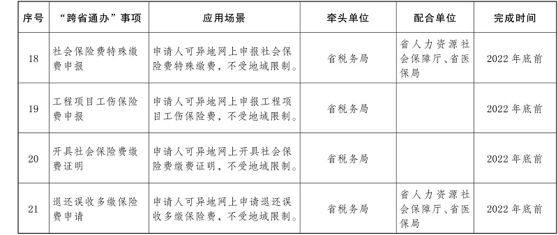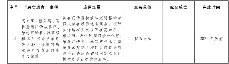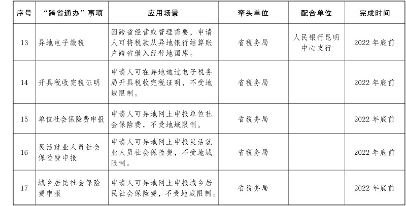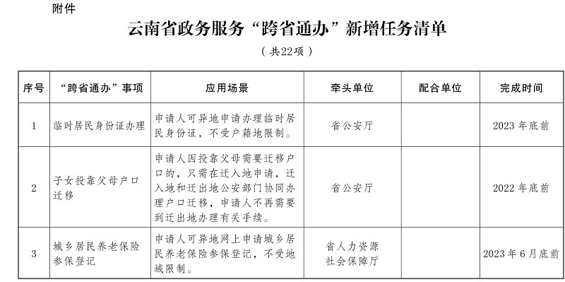 ?。ㄒ唬┬略鲆慌哳l政務(wù)服務(wù)“跨省通辦”事項(xiàng)。按照國辦發(fā)〔2022〕34號文件要求,加快推進(jìn)“臨時(shí)居民身份證辦理”、“子女投靠父母戶口遷移”、“城鄉(xiāng)居民養(yǎng)老保險(xiǎn)參保登記”等22項(xiàng)政務(wù)服務(wù)事項(xiàng)“跨省通辦”(任務(wù)清單見附件)。各地、有關(guān)部門要持續(xù)深化落實(shí)《云南省人民政府辦公廳關(guān)于印發(fā)云南省加快推進(jìn)政務(wù)服務(wù)“跨省通辦”實(shí)施方案的通知》(云政辦發(fā)〔2020〕62號)要求,并按照需求量大、覆蓋面廣、辦理頻次高的原則,逐步推出更多高頻政務(wù)服務(wù)“跨省通辦”事項(xiàng)。(省公安廳、省人力資源社會保障廳、省自然資源廳、省住房城鄉(xiāng)建設(shè)廳、省交通運(yùn)輸廳、省水利廳、省醫(yī)保局、省稅務(wù)局、人民銀行昆明中心支行等部門和單位,各州、市人民政府負(fù)責(zé);按照任務(wù)清單時(shí)限要求完成)