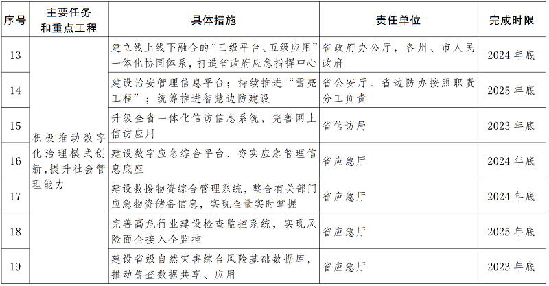 推進(jìn)應(yīng)急管理數(shù)字化應(yīng)用。建設(shè)數(shù)字應(yīng)急綜合平臺(tái),夯實(shí)應(yīng)急管理信息底座。建設(shè)救援物資綜合管理系統(tǒng),整合有關(guān)部門應(yīng)急物資儲(chǔ)備信息,實(shí)現(xiàn)全量實(shí)時(shí)掌握。完善高危行業(yè)建設(shè)檢查監(jiān)控系統(tǒng),實(shí)現(xiàn)風(fēng)險(xiǎn)面全監(jiān)控。建設(shè)省級(jí)自然災(zāi)害綜合風(fēng)險(xiǎn)基礎(chǔ)數(shù)據(jù)庫(kù),推動(dòng)普查數(shù)據(jù)共享應(yīng)用。完善應(yīng)急“一張圖”系統(tǒng)建設(shè),實(shí)現(xiàn)“一圖”數(shù)據(jù)集成、應(yīng)用集成、資源調(diào)度、指揮作戰(zhàn)。完善應(yīng)急智慧窄帶無(wú)線通信網(wǎng)絡(luò)和衛(wèi)星電話系統(tǒng)建設(shè)。