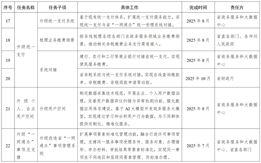 2025年12月31日前,統(tǒng)籌省級政務服務公共平臺基礎(chǔ)能力建設(shè)和保障,滿足全省數(shù)字政務公共基礎(chǔ)能力“總支撐”需求,通過完善統(tǒng)一身份認證、電子證照、電子印章、統(tǒng)一支付、統(tǒng)一用戶中心、應用能力開放平臺、AI大模型等基礎(chǔ)支撐能力,全面支撐全省政務服務業(yè)務應用。整合數(shù)字政務應用安全服務能力,實現(xiàn)集中監(jiān)控與管理,提升整體安全防護水平。