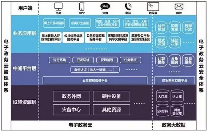 市級(jí)云架構(gòu):由設(shè)施資源層、中間平臺(tái)層、業(yè)務(wù)應(yīng)用層組成,在政務(wù)云管理體系和安全體系保障下,通過(guò)各類(lèi)用戶終端,為政府內(nèi)部提供統(tǒng)一信息化支撐,向社會(huì)公眾提供高效外部服務(wù)。(圖2)
