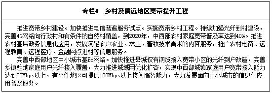 實施網(wǎng)絡(luò)覆蓋工程。加快貧困地區(qū)互聯(lián)網(wǎng)建設(shè)和應(yīng)用步伐,鼓勵電信企業(yè)積極承擔(dān)社會責(zé)任,確保寬帶進(jìn)村入戶與脫貧攻堅相向而行。加快推進(jìn)貧困地區(qū)網(wǎng)絡(luò)覆蓋,深入落實提速降費,探索面向貧困戶的網(wǎng)絡(luò)資費優(yōu)惠。加快安全可靠移動終端研發(fā)和生產(chǎn)應(yīng)用,推動民族語言語音、視頻技術(shù)和軟件研發(fā),降低少數(shù)民族使用移動終端和獲取信息服務(wù)的語言障礙。