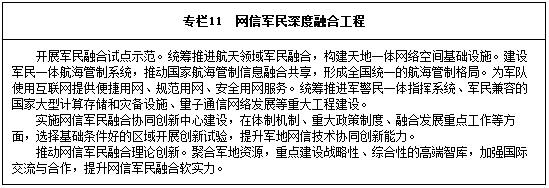 推進(jìn)信息基礎(chǔ)設(shè)施共建共用共享。統(tǒng)籌軍地信息傳輸網(wǎng)絡(luò)建設(shè),構(gòu)建軍民共用的國家光纜網(wǎng)。深化天基通信系統(tǒng)融合發(fā)展,加快推動軍民共用全球移動通信衛(wèi)星系統(tǒng)建設(shè)。推進(jìn)電磁頻譜管理專項工程建設(shè),構(gòu)建軍民協(xié)同合作的電磁頻譜監(jiān)測、檢測和探測網(wǎng)系。加強(qiáng)軍民共用信息系統(tǒng)建設(shè),鼓勵軍隊以購買、外包等方式從市場獲取高質(zhì)量、低成本的信息產(chǎn)品,充分挖掘利用民間優(yōu)勢數(shù)據(jù)資源和數(shù)據(jù)開發(fā)能力。實施軍民融合信息資源開發(fā)利用工程,完善安全可靠的軍地信息資源共享交換平臺,規(guī)范軍事信息資源向社會開放,探索利用企業(yè)互聯(lián)網(wǎng)平臺和社會科技資源為軍隊服務(wù)。加強(qiáng)國防科技工業(yè)綜合管理信息化建設(shè)。