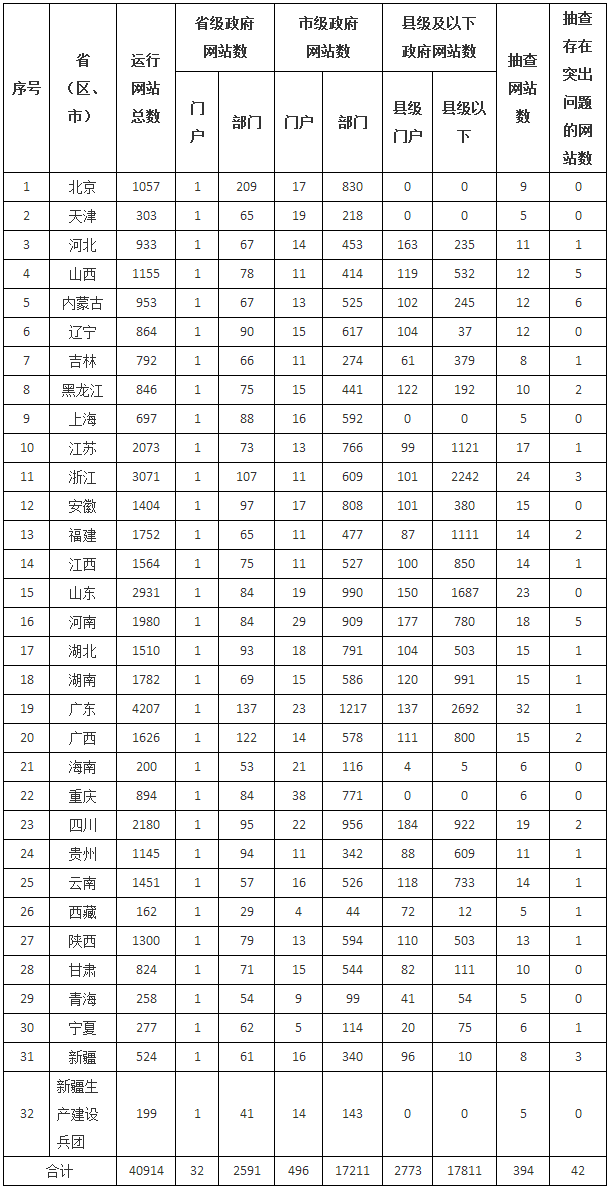 (一)總體情況。第一季度,全國正在運(yùn)行的政府網(wǎng)站43143家。其中,國務(wù)院部門及其內(nèi)設(shè)、垂直管理機(jī)構(gòu)政府網(wǎng)站2229家,省級政府門戶網(wǎng)站32家,省級政府部門網(wǎng)站2591家,市級政府門戶網(wǎng)站496家,市級政府部門網(wǎng)站17211家,縣級政府門戶網(wǎng)站2773家,縣級以下政府網(wǎng)站17811家。