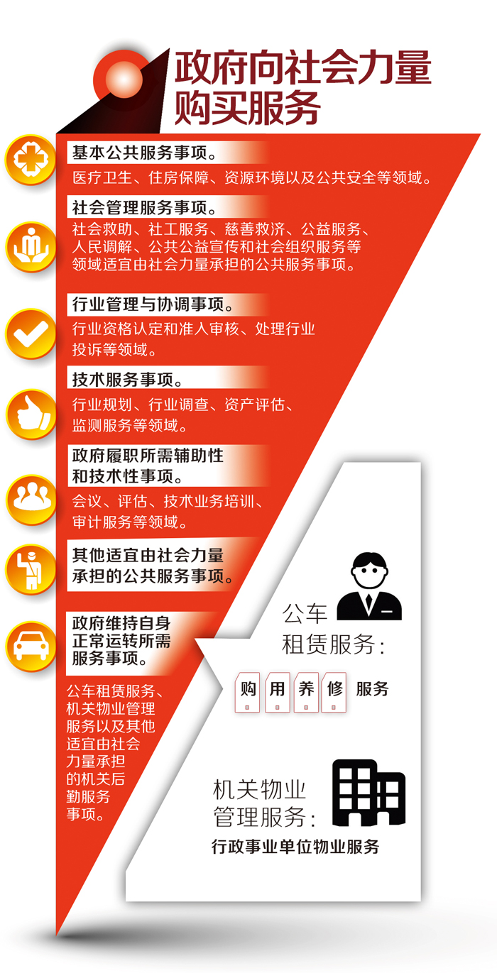《目錄》共確定了7類一級目錄,包括基本公共服務(wù)事項,社會管理服務(wù)事項,行業(yè)管理與協(xié)調(diào)事項,技術(shù)服務(wù)事項,政府履職所需輔助性和技術(shù)性事項,政府維持自身正常運轉(zhuǎn)所需服務(wù)事項,以及其他適宜由社會力量承擔(dān)的公共服務(wù)事項,細分為267項內(nèi)容。涉及教育、人才服務(wù)、醫(yī)療衛(wèi)生、住房保障、社會救助、法律援助、行業(yè)資格認定和準入審核、行業(yè)調(diào)查、法律服務(wù)、績效評價、公車租賃服務(wù)、機關(guān)物業(yè)管理服務(wù)等。