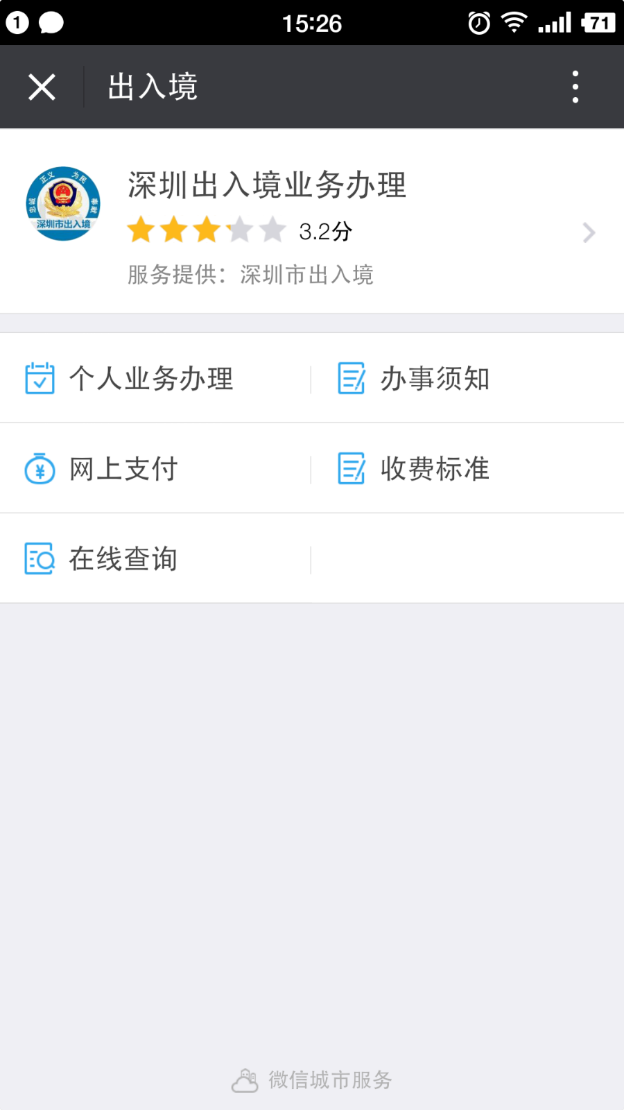 首先,微信城市服務對"深圳出入境業(yè)務辦理"進行了卡片式、菜單式設計,對業(yè)務名稱、業(yè)務類別及要素進行了細致的區(qū)分和歸類,此外還結合用戶的互動特征,加入了星級評分,用戶可針對在線辦事體驗對辦事機構進行打分和評價,這種反饋機制的便捷、直觀和公共性也正是"互聯網+政務"優(yōu)化政務服務流程和提升政務服務質量的重要支撐要素。