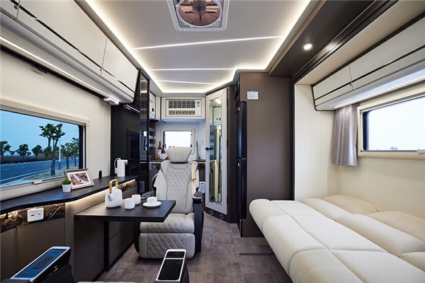 此外,為了能為商務(wù)人士們帶來愜意生活,生活家H90也配備了強勁的電力系統(tǒng)。其搭載了新一代、功率更高的48V智能雙發(fā)電機,能做到行車一小時、發(fā)6度電。不僅于此,這輛房車還配備了車規(guī)級開發(fā)14.5kWh磷酸鐵鋰電池+4kW充逆變一體機+800W太陽能板,相較于宇通C530所搭載的10.5kWh鋰電池+3kW充逆變一體機,其電量更充沛、用電更少限制。哪怕在開啟車內(nèi)48V空調(diào)時,也可以無憂使用3個220V大功率電器,完全不必因考慮電量過載而束手束腳。