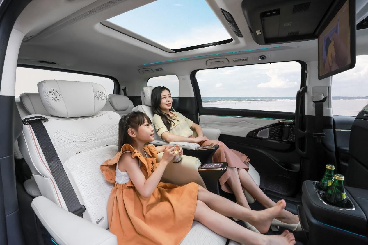 具體來看,E9采用同級獨(dú)有半苯胺高級真皮面料,二排豪華頭等艙座椅讓你“一鍵SPA”,釋放旅途中的疲憊,還有二排15.6英寸智慧吸頂屏、12.3英寸副駕娛樂屏等,無論哪個(gè)位置都能觀影娛樂,享受旅途中的美好時(shí)光。