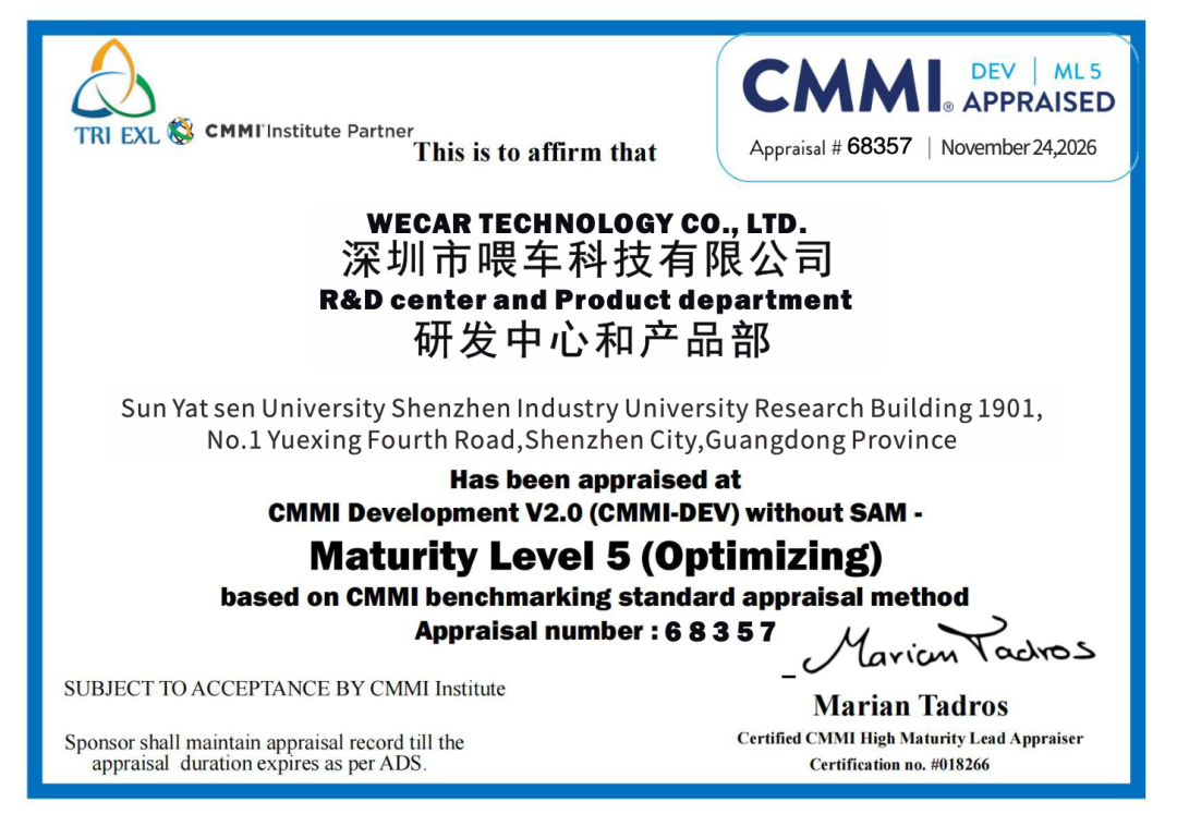 近日,喂車科技順利通過全球軟件領域最 高級別認證CMMI 5級(簡稱CMMI5)認證!