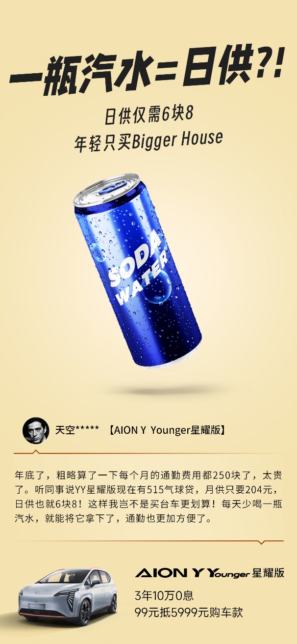 不過(guò)最終讓我下定決心的,還是AION Y非常給力的金融政策,像我看中的YY星耀版,選擇515氣球貸,算下來(lái)月供只需要204元,平均一天不到一瓶汽水的錢,老實(shí)說(shuō)我每個(gè)月光坐地鐵都不止這點(diǎn)錢。而且YY星耀版也還能用99元抵5999元的購(gòu)車款,首付這里又可以給我省下一筆,正好可以給女友換個(gè)新華為手機(jī)。