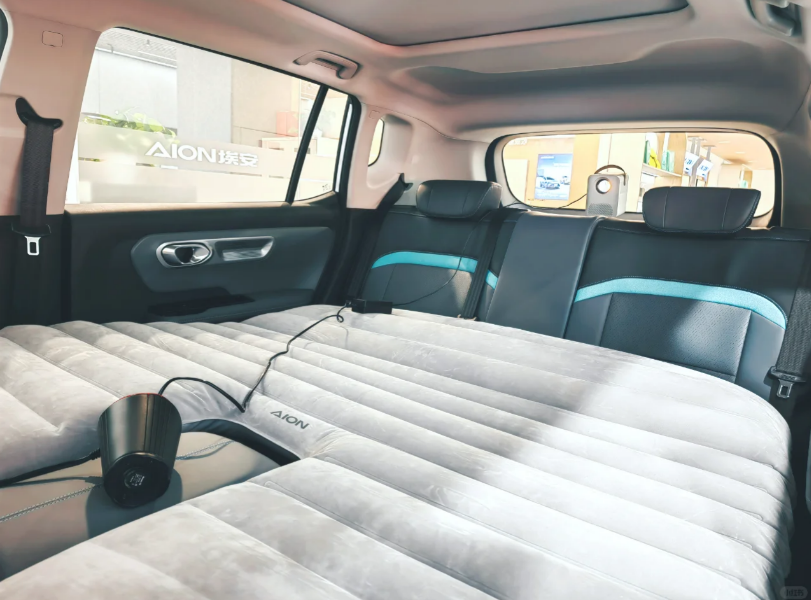 然后我們就去看了AION Y,女友一眼就看中了AION Y的車身顏色,感覺(jué)很潮。打開(kāi)車門,我們驚訝地發(fā)現(xiàn)里面居然放了一張超大的氣墊床,我抬起氣墊床才發(fā)現(xiàn),原來(lái)AION Y的兩排座椅都是可以放平的,這樣一來(lái)車內(nèi)空間就很靈活了,不僅后排能裝更多東西,出去野營(yíng)的時(shí)候車子還能變成一個(gè)大帳篷,朋友們?cè)谲嚴(yán)镩_(kāi)黑野餐很舒服。調(diào)好座椅,AION Y的后排明顯比海豚大了很多,座椅也更舒服,即便是長(zhǎng)途也不容易累。