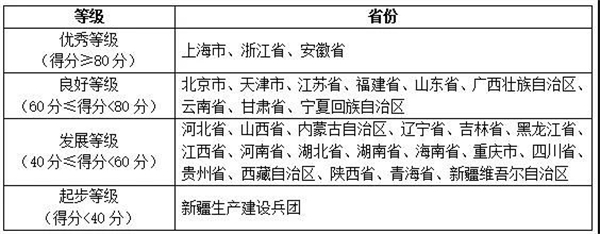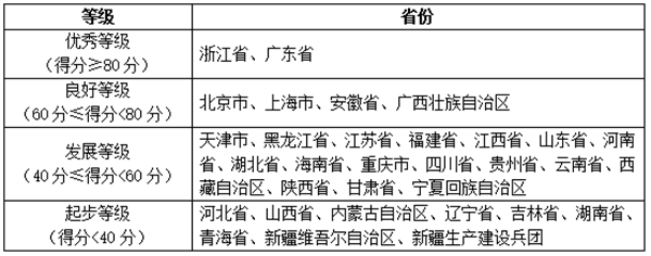 報告將各省移動政務(wù)服務(wù)渠道的綜合服務(wù)能力以及單項服務(wù)能力劃分為四個等級,分別是優(yōu)秀等級(得分≥80分)、良好等級(60分≤得分<80分)、發(fā)展等級(40分≤得分<60分)和起步等級(得分<40分),具體名單如下表所示:
