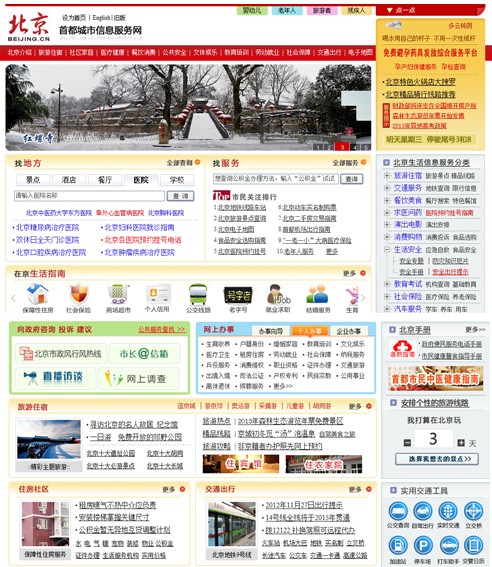 (1)服務(wù)事項全面,融合各類辦事服務(wù)、公共服務(wù),真正體現(xiàn)“一站式”服務(wù)宗旨。網(wǎng)站不僅按照服務(wù)類型提供了北京介紹、旅游住宿、社區(qū)家庭、醫(yī)療健康、餐飲消費、公共安全、文體娛樂、教育培訓、勞動就業(yè)、社會保障、交通出行、電子地圖十二大公共信息服務(wù)欄目,還綜合地納入了公眾互動渠道、辦事服務(wù)渠道入口,方便有