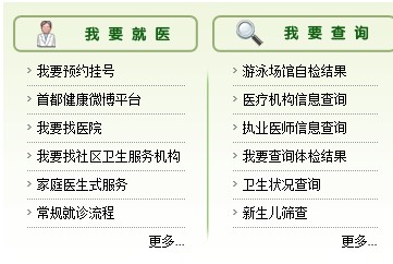 ?。?)我要查詢欄目集中整合了游泳場館自檢結(jié)果、醫(yī)療機構(gòu)信息查詢、執(zhí)業(yè)醫(yī)師信息查詢、體檢結(jié)果查詢、衛(wèi)生狀況查詢、新生兒篩查、新農(nóng)合補償查詢、醫(yī)藥價格查詢、接種信息查詢、科技成果查詢、化驗結(jié)果查詢、護士信息查詢等近15項查詢服務(wù),用戶可通過這一入口查詢有關(guān)醫(yī)療衛(wèi)生相關(guān)的各類服務(wù)信息。且各區(qū)縣衛(wèi)生局等