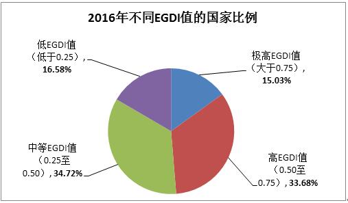 整體調(diào)查結(jié)果來看,各國電子政務(wù)水平增長快速。EGDI值劃分為極高、高、中等和低共4個(gè)類別,具有"高EGDI值"和"極高EGDI值"的國家數(shù)量在 2016年有所增加。具有極高EGDI值的國家有29個(gè),大多數(shù)為歐洲國家(占比66%);具有高EGDI值的國家為65個(gè),這個(gè)數(shù)據(jù)相較于2014年的調(diào)查有3個(gè)國家的增加;具有中等EGDI值的國家數(shù)量為67個(gè);具有低EGDI值的國家數(shù)量為32個(gè)。