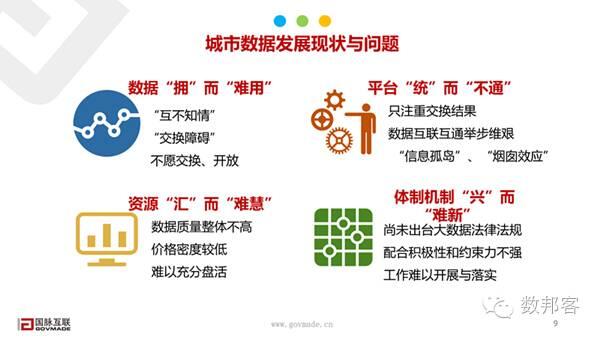 我們要解決的問題有哪些?最重要的問題是我們目前城市發(fā)展現(xiàn)狀里的數(shù)據(jù)"擁而難用"。我們數(shù)據(jù)互不執(zhí)行,交換障礙,不愿意交換,也不愿意開放,為什么?各個(gè)部門都認(rèn)為這個(gè)數(shù)據(jù)是我的,怎么開放出來?但是城市級(jí)數(shù)據(jù)資源,大家等到通過分享能夠獲得價(jià)值的時(shí)候都會(huì)愿意拿出來。數(shù)據(jù)"擁"而"難用",平臺(tái)"統(tǒng)"而"不通",資源"匯"而 "難慧",這個(gè)數(shù)據(jù)質(zhì)量整體不高,利用價(jià)值比較低,難以充分的盤活;體制機(jī)制"興"而 "難新",目前尚未出臺(tái)大數(shù)據(jù)的法律法規(guī),積極性和約束力都不強(qiáng),所以它的動(dòng)力機(jī)制不夠,導(dǎo)致有些工作難以解決這些問題和現(xiàn)狀。