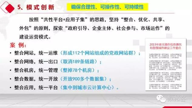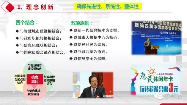 第一個,理念的創(chuàng)新。因為理念的創(chuàng)新要求確保我們的理念的先進性,系統(tǒng)性跟整體性,而不是想到哪里做到哪里。所以在考慮這個問題以后我們要做到四個結(jié)合:與智慧城市建設(shè)相結(jié)合,與政府的職能轉(zhuǎn)換相結(jié)合,與信息化的現(xiàn)狀相結(jié)合,與國家綜合試點相結(jié)合。要遵守五項原則:以新一代信息技術(shù)為支撐,以城市大數(shù)據(jù)作為核心,以便民利民作為宗旨,以互聯(lián)共享作為原則,以信息安全作為保障,這就是在架構(gòu)中我們一個什么樣的理念,最后它生出來的就是一個什么樣的孩子。
