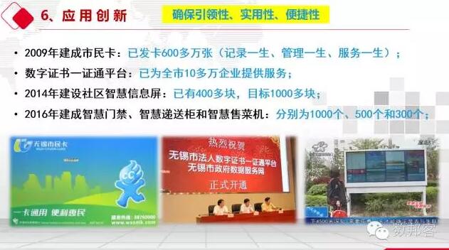 第六,應(yīng)用創(chuàng)新。應(yīng)用創(chuàng)新的案例太多了,一般在場合中我都不太講應(yīng)用的,因為政府做引導(dǎo)就好,很多的應(yīng)用都是社會化的。引幾個案例,2009年建立了市民卡,它是記錄一生、管理一生、服務(wù)一生的,它獲得了2009年中國信息化成就獎,是整個應(yīng)用創(chuàng)新的典型案例。因為應(yīng)用創(chuàng)新要保證我們應(yīng)用的引領(lǐng)性、實用性和便利性。我們的數(shù)字證書一整套平臺,這個也是全國領(lǐng)先的,現(xiàn)在已經(jīng)有十多萬企業(yè)在上面應(yīng)用了,也就是不要每一個東西都要給企業(yè)發(fā)一個數(shù)字證書,現(xiàn)在任何數(shù)字證書在我們平臺上都是通用的,每一個企業(yè)一張身份認證就可以了。2014年建成了社區(qū)智慧信息屏,我們的目標是一千塊。2016年建成了門禁系統(tǒng)、智慧遞送柜和智慧售菜機,看名字很簡單,但是確確實實放在了社區(qū)為老百姓提供了便捷服務(wù)。