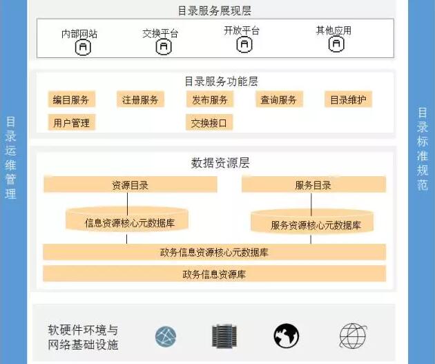 上圖是對政務信息資源目錄體系的架構進行展示:它主要包括基礎設施層,軟硬件環(huán)境和網絡基礎設施。上面一層是數據資源層,包括政務信息資源庫、政務信息資源核心元數據庫,以及資源目錄、服務目錄等。目錄服務的功能層,主要的功能包括對編目服務、注冊服務、目錄的發(fā)布服務、目錄的查詢服務、目錄的維護、用戶管理以及交換接口。最上面是目錄服務的展現層,也就是說各個部門或者說大眾查詢展現層,包括內部的網站,交換的平臺,開放的平臺。包括一些其他的應用。同時為了保障目錄體系的規(guī)范化管理,它還會涉及到保障層,包括對于目錄的運維管理,以及目錄一系列的標準規(guī)范,如信息資源編碼規(guī)范,以及元數據的規(guī)范等等。