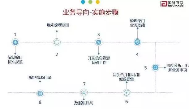 技術導向的實施步驟同業(yè)務導向的實施步驟有幾個地方的差異,主要是第四、第五,第四個我們要了解系統(tǒng)功能,整理業(yè)務屬性,通過線上調研察看系統(tǒng)的方式,來了解系統(tǒng)的功能。第五個是按照系統(tǒng)的業(yè)務主線來梳理信息資源。比如說剛才所說的通過查看技術文檔,導出數據結構等方式來進行梳理,下面都是一樣的。