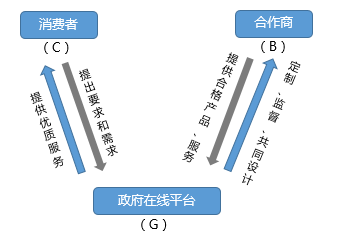 C2B2G強調(diào)生態(tài)化治理系統(tǒng)。C指消費者,B指參與企業(yè),G指政府平臺,C2B2G是消費者通過在線政務(wù)平臺,實現(xiàn)公眾與企業(yè)之間、公眾與政府之間的信息交流。互聯(lián)網(wǎng)泛在化,淡化傳統(tǒng)政務(wù)固有的公眾、企業(yè)與政府界限,場景應用在三者之間形成一個服務(wù)閉環(huán)。在集成化的政務(wù)平臺上,公眾提出需求,平臺合作商對需求進行分析和評估,吸引公眾參與共同治理政務(wù)。C2B2G是政務(wù)治理市場化的主要形態(tài)(見下圖)。
