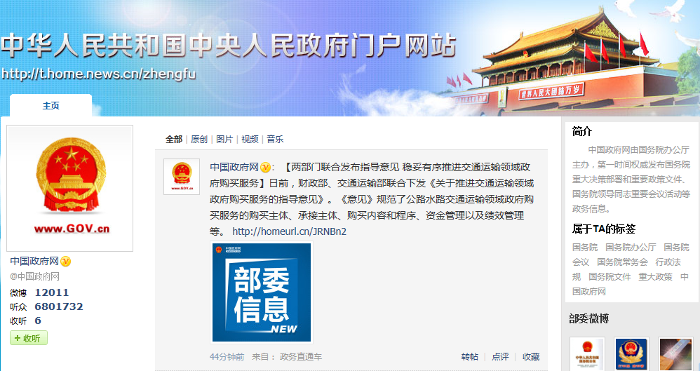 2013年10月開始,國務(wù)院官方微博分別在新華微博、人民微博、騰訊微博、新浪微博四大主體微博平臺上線,官方微信也同期推出,成為發(fā)布國務(wù)院領(lǐng)導(dǎo)同志政務(wù)活動信息、國務(wù)院重要會議信息、國務(wù)院和國務(wù)院辦公廳公開發(fā)布的政策文件及解讀稿件等政務(wù)信息的新媒體渠道。微博微信的推出拉近了中南海和普通民眾的距離,進一步提升了政府的透明度和公信力。