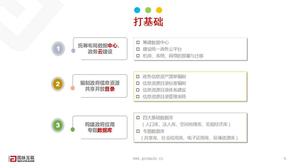 在打基礎(chǔ)上,各級政府部門需要統(tǒng)籌布局?jǐn)?shù)據(jù)中心、政務(wù)云建設(shè),在政務(wù)云建設(shè)之后要重點考慮籌建數(shù)據(jù)中心,建設(shè)統(tǒng)一政務(wù)云平臺還有機房、系統(tǒng)、網(wǎng)絡(luò)的部署與遷移;在編制政府信息資源、共享開放目錄方面,從政務(wù)信息資產(chǎn)清單編制到信息資源目錄標(biāo)準(zhǔn)編制再到信息資源目錄體系建設(shè)以及信息資源目錄管理系統(tǒng)的建設(shè)都非常重要。信息資源共享開放目錄是基礎(chǔ)工程也是非常重要的工程。構(gòu)建政府應(yīng)用專題數(shù)據(jù)庫方面,除了構(gòu)建四大基礎(chǔ)數(shù)據(jù)庫(人口庫、法人庫、空間地理庫、宏觀經(jīng)濟庫),還要構(gòu)建專題數(shù)據(jù)庫(共享庫、社會信用庫、電子證照庫、環(huán)境資源庫)。