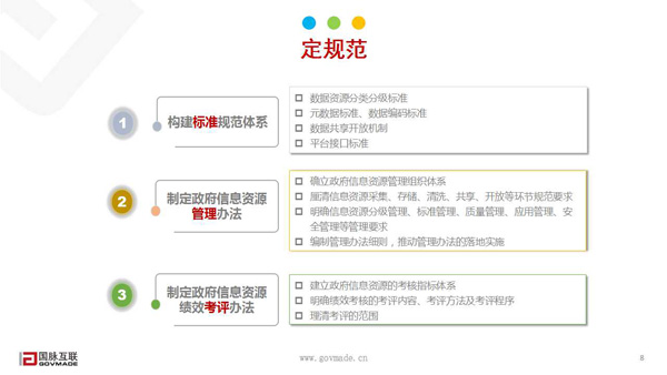 無論是建目錄、建平臺還是做共享開放等等之前都要規(guī)定一個規(guī)范,規(guī)范也是目前各級政府很難做數(shù)據(jù)開展的源頭,所以規(guī)范是非常重要的。規(guī)范首先是要構(gòu)建標(biāo)準(zhǔn)規(guī)范體系,包括數(shù)據(jù)資源分類分級標(biāo)準(zhǔn)、元數(shù)據(jù)標(biāo)準(zhǔn)、數(shù)據(jù)編碼標(biāo)準(zhǔn)、數(shù)據(jù)共享開放機制、平臺接口標(biāo)準(zhǔn)。比較重要的是制定政府信息資源管理辦法,管理辦法主要是確立政府信息資源管理組織體系,厘清信息資源采集、存儲、清洗、共享、開放等環(huán)節(jié)規(guī)范要求,明確信息資源分級管理、標(biāo)準(zhǔn)管理、質(zhì)量管理、應(yīng)用管理、安全管理等管理要求,編制管理辦法細(xì)則,推動管理辦法的落地實施。同時因為管理辦法很難細(xì)化,所以需要制定政府信息資源績效考評辦法,建立政府信息資源的考核指標(biāo)體系,明確績效考核的考評內(nèi)容、考評方法及考評程序,理清考評的范圍。