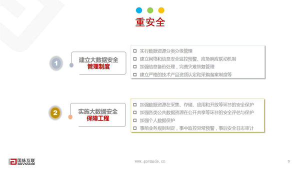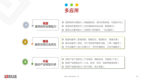 最后是政務(wù)數(shù)據(jù)的開發(fā)應(yīng)用,主要是通過三個方面來體現(xiàn)政務(wù)數(shù)據(jù)的應(yīng)用程度。首先是優(yōu)政,提高政府治理能力。體現(xiàn)在提高政府決策能力(用數(shù)據(jù)說話、領(lǐng)導(dǎo)決策桌面、可視化平),提高政府管理水平(社區(qū)網(wǎng)格化綜合治理、智慧城市),提高公共服務(wù)能力(互聯(lián)網(wǎng)+政務(wù)服務(wù)、一站式服務(wù))。然后是惠民,服務(wù)改善社會民生。主要體現(xiàn)在智慧化服務(wù)(智慧旅游、智慧民生、智慧醫(yī)療、智慧交通),移動化服務(wù)(微信、支付寶等城市服務(wù)功能、三微一端服務(wù)),平臺化服務(wù)(網(wǎng)上辦事大廳、市民專屬網(wǎng)頁、企業(yè)專屬網(wǎng)頁)。最后就是興業(yè),推動產(chǎn)業(yè)轉(zhuǎn)型升級。主要體現(xiàn)在加快產(chǎn)業(yè)產(chǎn)品研發(fā)(產(chǎn)業(yè)轉(zhuǎn)型、智能改造、互聯(lián)網(wǎng)+產(chǎn)業(yè)),提高產(chǎn)業(yè)管理水平(人員、財務(wù)、庫存、銷售等管理系統(tǒng)),提高產(chǎn)業(yè)服務(wù)能力(電子商務(wù)、網(wǎng)上客服)。