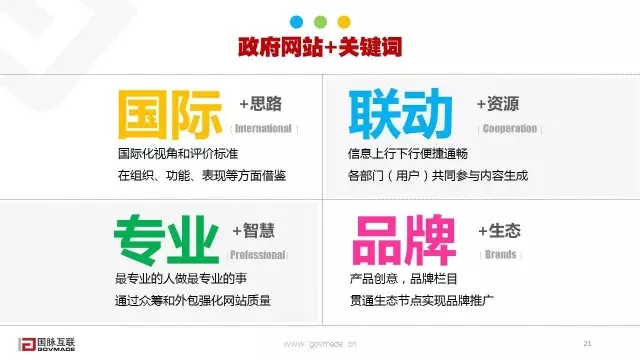 第四個(gè)是品牌,政府網(wǎng)站建設(shè)要樹立產(chǎn)品化的思維。通過強(qiáng)化日常運(yùn)營管理的規(guī)范來提升欄目的質(zhì)量,樹立一些品牌欄目提升網(wǎng)站信息輸出的力量,同時(shí)要充分的運(yùn)用生態(tài)的手段來強(qiáng)化網(wǎng)站的推廣。