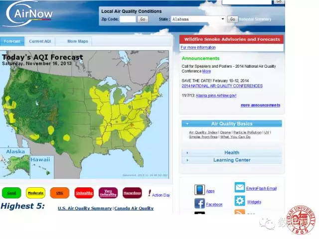 下面這個是關(guān)于空氣質(zhì)量數(shù)據(jù)的公開,你可以看到全美實時的空氣質(zhì)量情況,綠色的空氣質(zhì)量比較好,黃色的有一點問題,紅色的就是有毒了。中國近些年北京上海也開展了類似的環(huán)境信息公開工作。