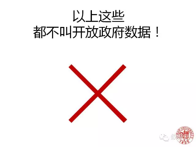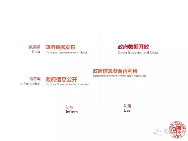 在這張表上,橫向是從知情到利用,縱向是從信息層到數(shù)據(jù)層。開放政府?dāng)?shù)據(jù)在右上角,要開放到數(shù)據(jù)層,并且保證社會對數(shù)據(jù)的利用。政府信息公開是為了保障知情權(quán),開放的是信息層。一些政府網(wǎng)站上也發(fā)布了一些數(shù)據(jù),但這就像政府在大門上貼出一張告示,說這就是政府的數(shù)據(jù)分析結(jié)果,而政府?dāng)?shù)據(jù)開放是政府打開一個門,說這里面的數(shù)據(jù),你們可以拿去用。過去還提過政府信息資源再利用,這和開放數(shù)據(jù)的差別是數(shù)據(jù)資源只給自己指定的公司用,但這可能涉及到數(shù)據(jù)資源權(quán)利尋租的問題。開放數(shù)據(jù)應(yīng)該是如果你把數(shù)據(jù)給了A,就也可以給B,只要B也滿足了基本條件。