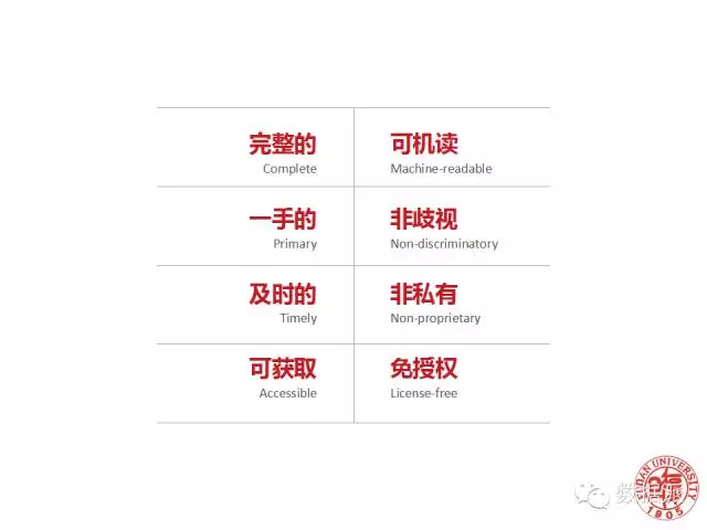 真正的開放數(shù)據(jù)要滿足以上這些標(biāo)準(zhǔn)。數(shù)據(jù)是完整的、原始的、一手的、及時的,可獲取的,有一個平臺可以讓我下載,而不是我私下里找你要,例如DATA.GOV這樣的平臺。開放數(shù)據(jù)是非歧視、非私有的,產(chǎn)權(quán)上來說這些數(shù)據(jù)屬于公共資源,并不屬于某個政府部門,而是屬于社會的公共資源。免授權(quán),獲取過程中不再需要填一系列表格協(xié)議,就可以到網(wǎng)上下載,美國政府開放的數(shù)據(jù)我們中國人也可以去下載。