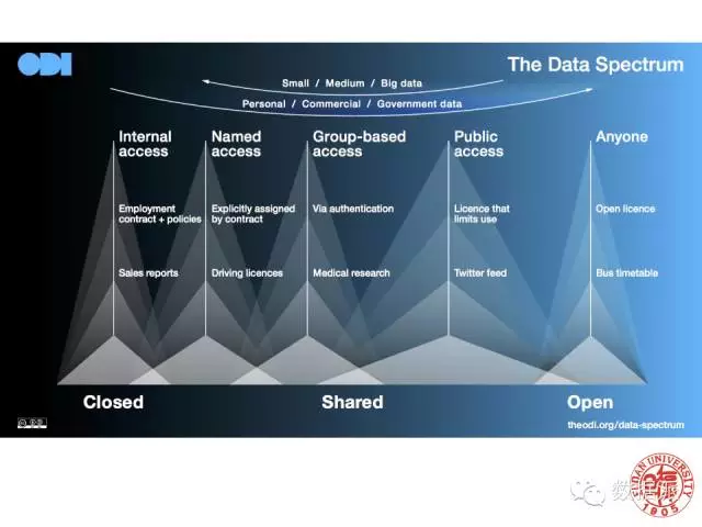 在跟英國開放數(shù)據(jù)研究院的交流中他們也提到,開放與封閉數(shù)據(jù)并不是非一即零的關(guān)系,中間有一個過渡階段,從完全封閉到完全開放中間有一個過渡階段,有些是有限度的開放,有一些是授權(quán)的開放。