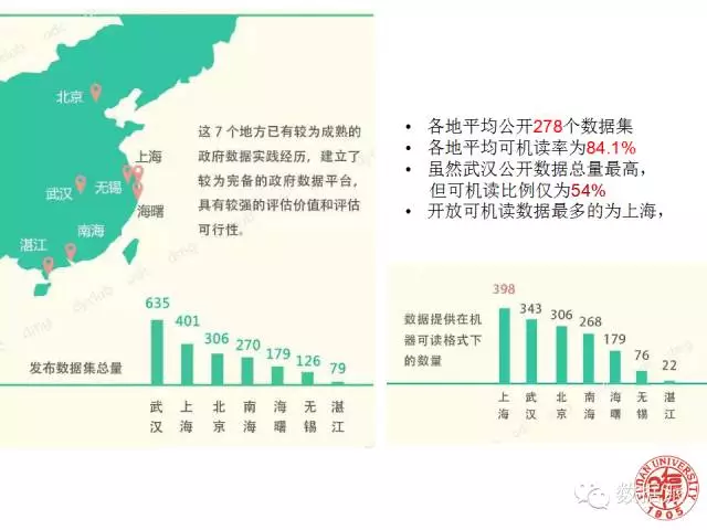 評估包括數(shù)據(jù)層和平臺層。各地平均公開了278個數(shù)據(jù)集。數(shù)據(jù)總量上看武漢是全國第一,但是武漢可機讀的數(shù)據(jù)只有一半,另外一半基本是PDF格式,不利于社會對數(shù)據(jù)的利用,不是真正的數(shù)據(jù)開放。